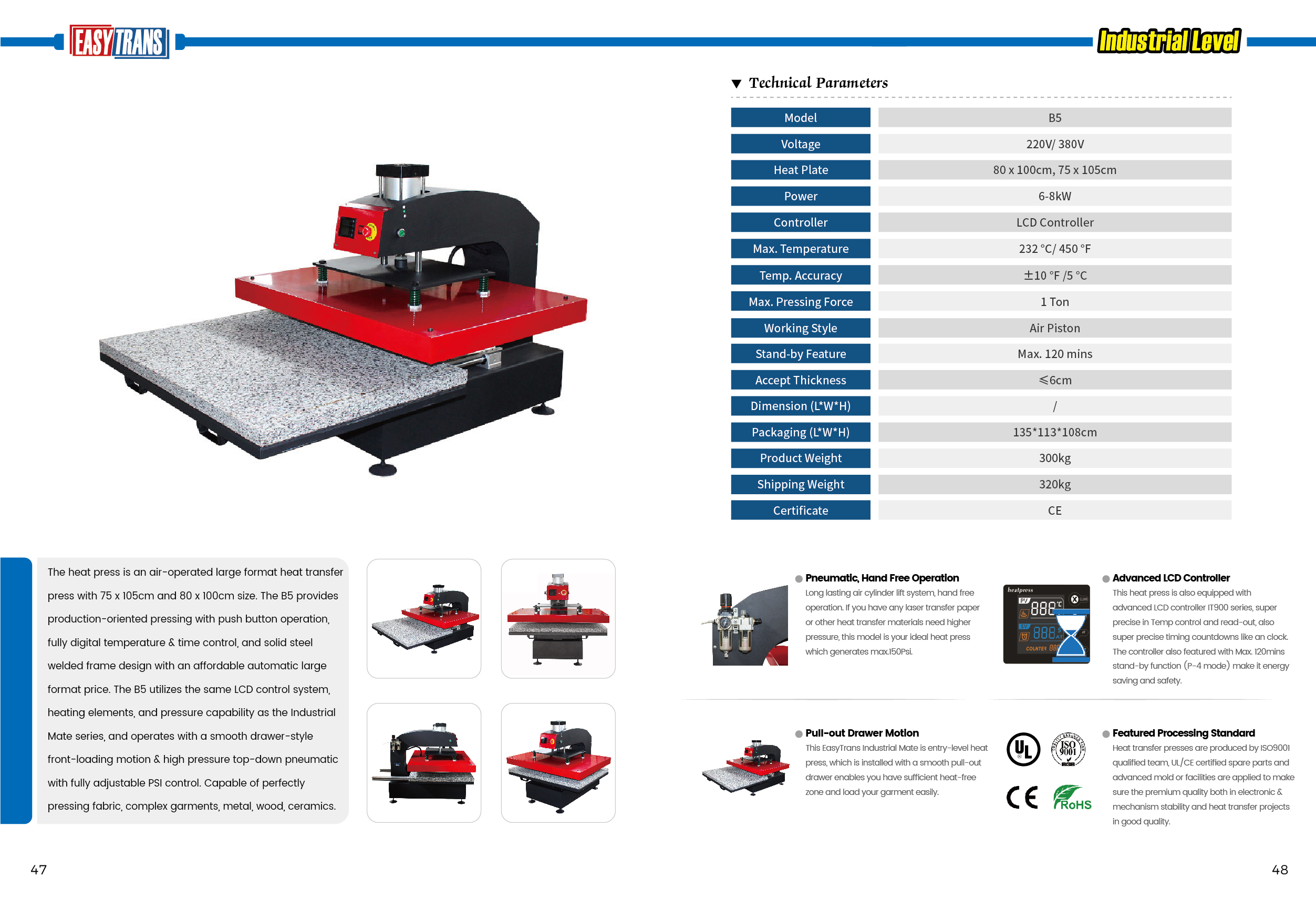 The B5 utilizes the same LCD control system, heating elements, and pressure capability as the Industrial Mate series, and operates with a smooth drawer-style front-loading motion & high pressure top down pneumatic with fully adjustable PSI control. Capable of perfectly pressing fabric, complex garments, metal, wood, ceramics.