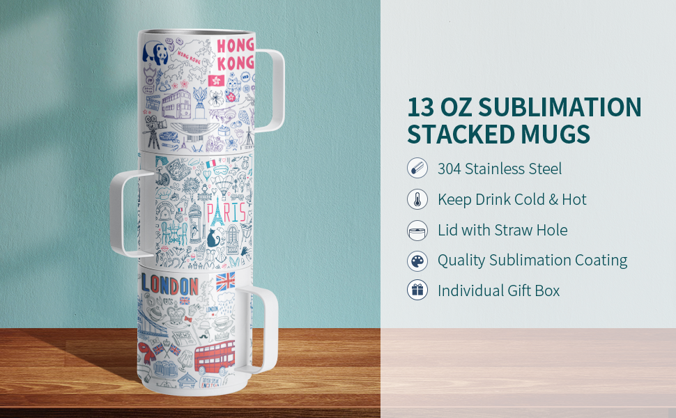 The stainless steel mug with stacked bottom which can put the mugs together.It's nice as the gift sets for your family,friends.