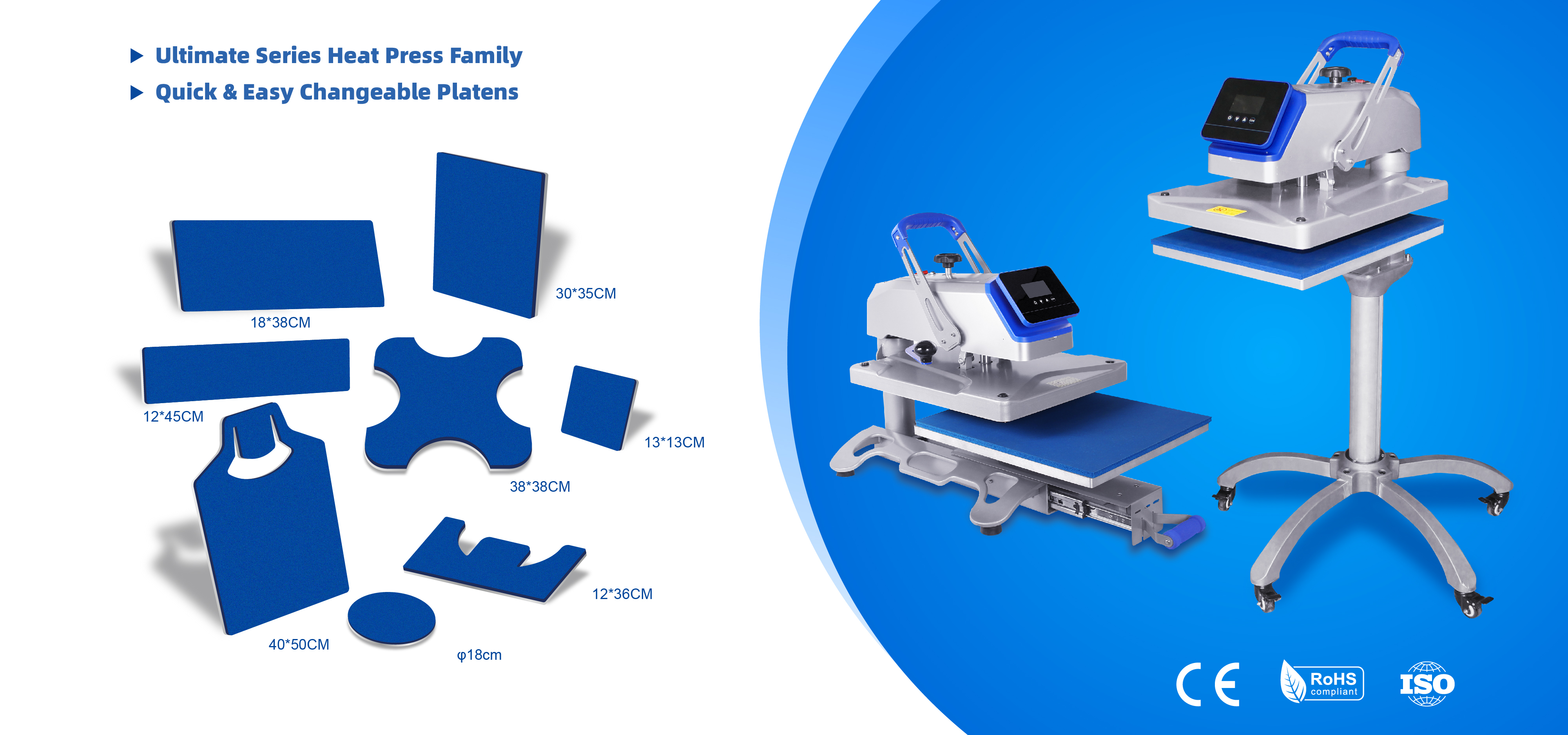 The EasyTrans Ultimate Series is a solution of any professional transfers. It’s line of higher-end heat press and culmination of smart idea. The EasyTrans Ultimate is designed for you, the business, working with heat transfer vinyl (HTV), heat transfer paper, sublimation, and white toner, etc. Use the Ultimate Series heat presses to make custom T-shirts, sports wears, jerseys, banners, backpacks, sleeves, sweaters and more. Available in 40x50cm or 33x45cm, the Ultimate heat presses feature a slide-out & multi-changeable lower platen. So you can work away from the heat and so many possibilities.