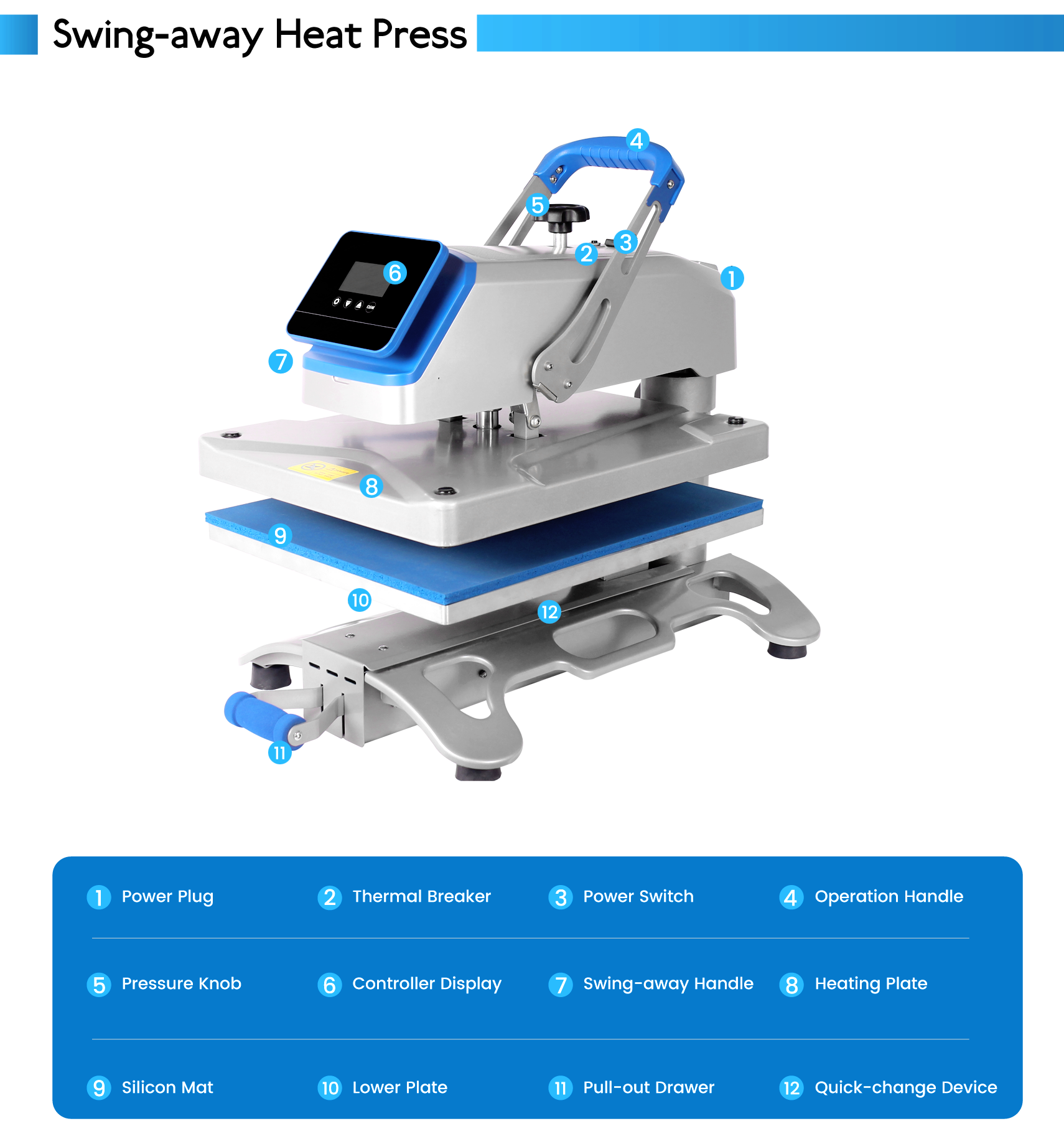 This EasyTrans Deluxe heat press is installed with featured pull-out drawer enables you have sufficient space to load your garment. Additional magnetic system is applied to the drawer and make sure drawer not sliding back during the threading the T-shirt or not sliding out during press down handle.