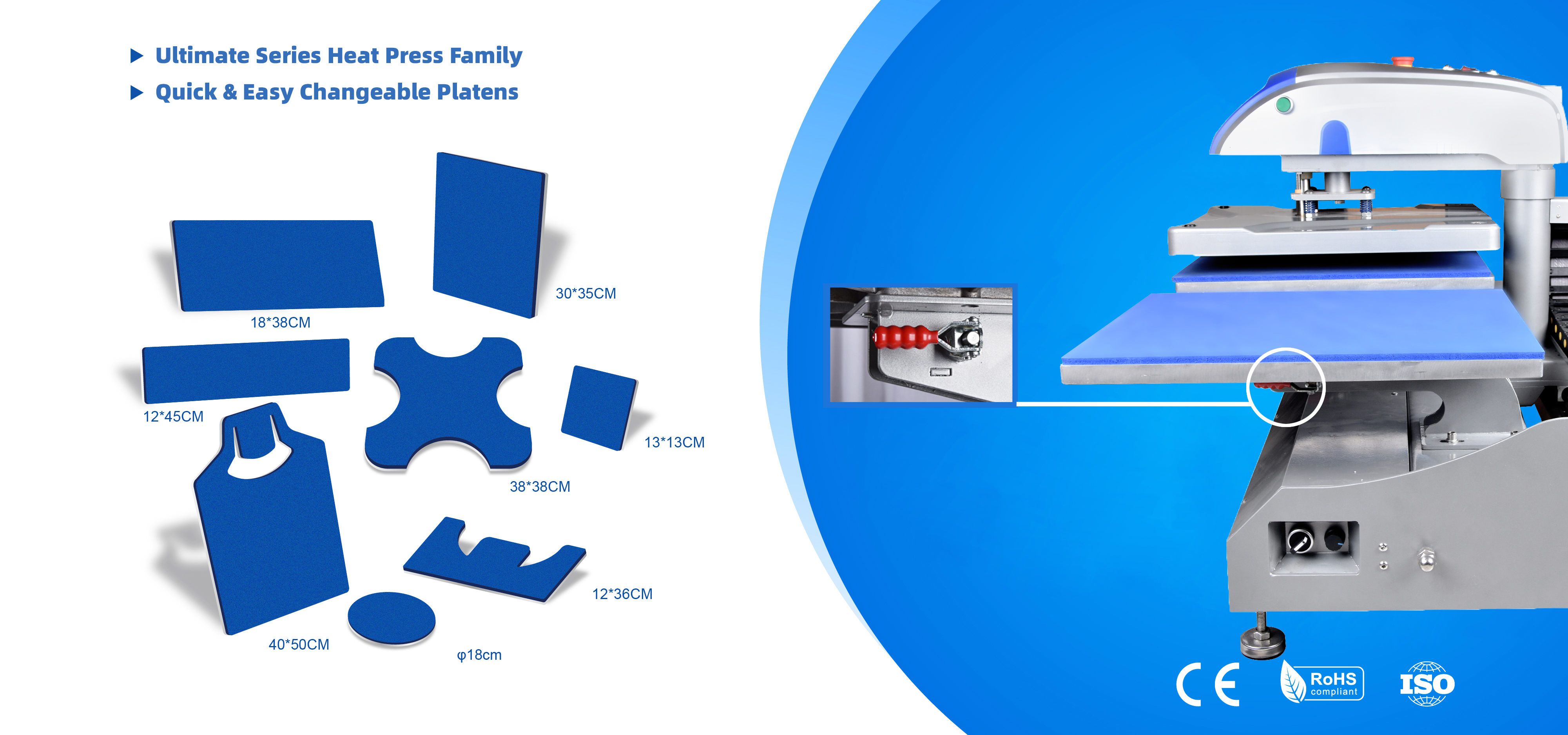 This EasyTrans Press is installed with a featured base: 1. Quick changeable system enables you to change the different accessory platen in few seconds. 2. The thread-able base enables you to load or rotate the garment over the lower platen.