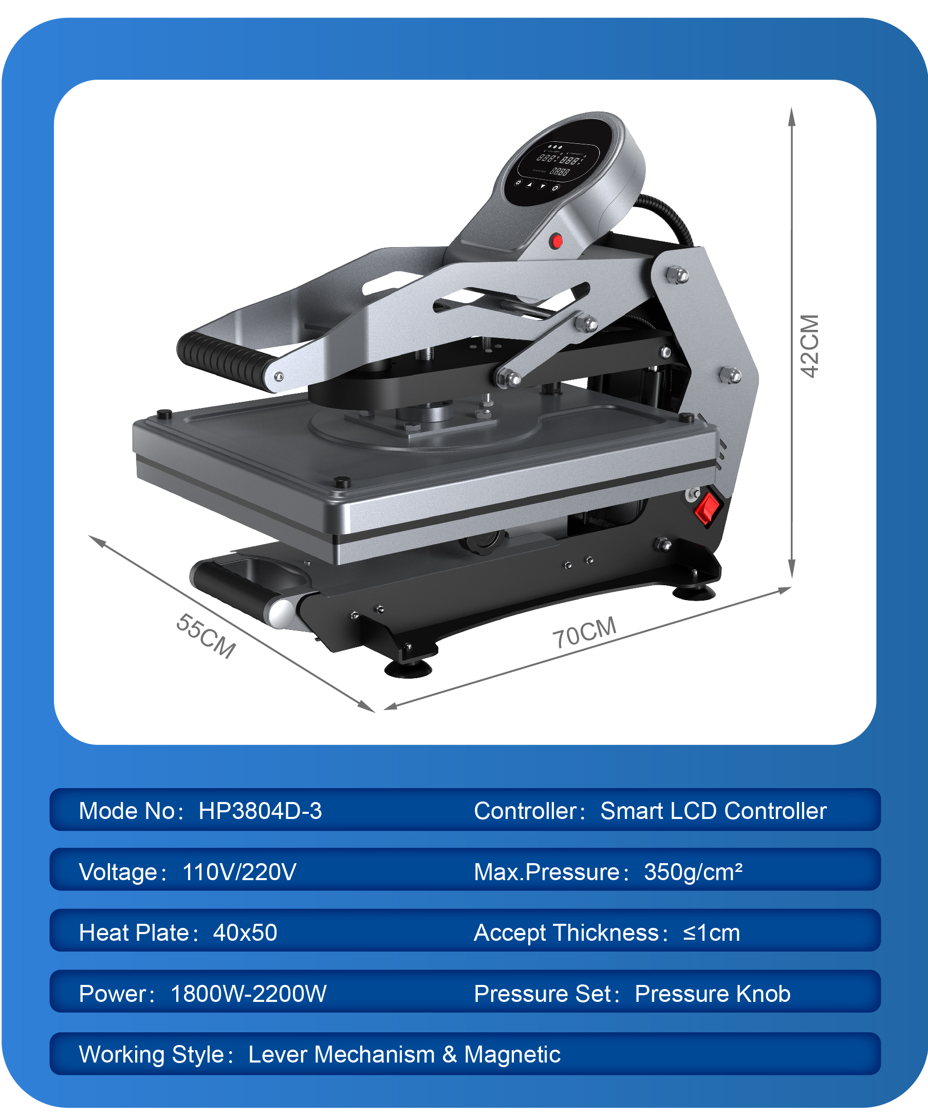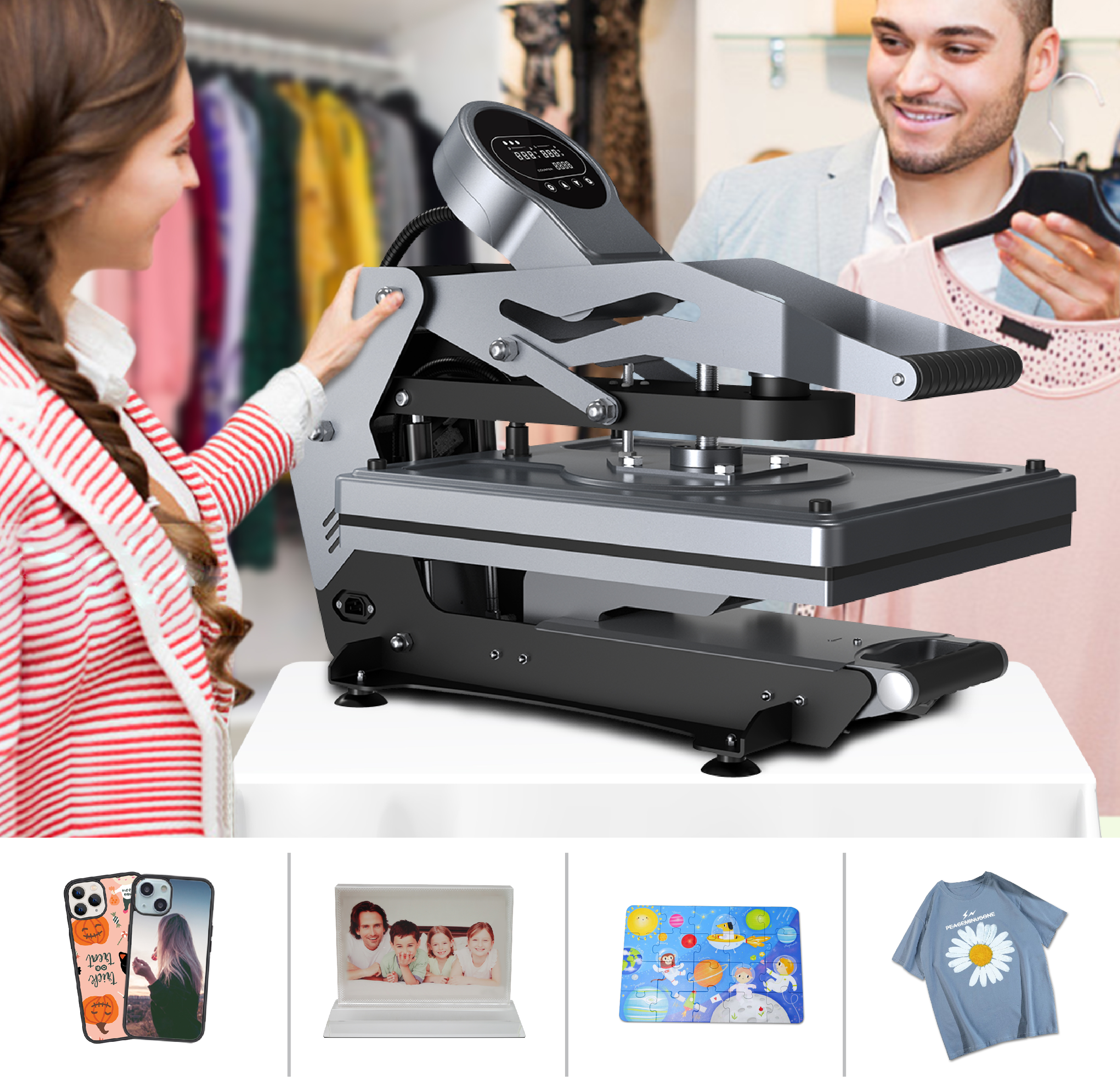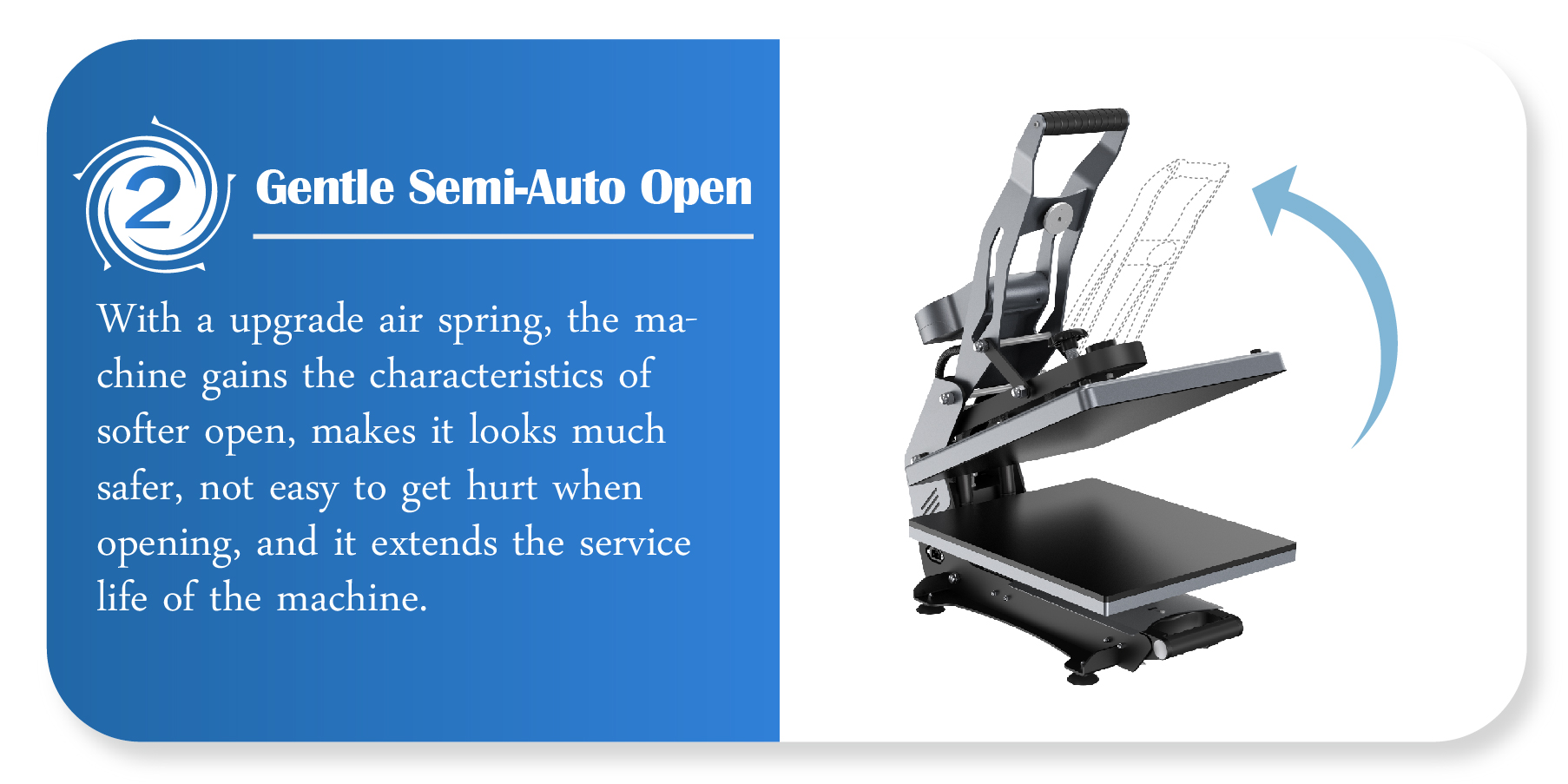The t-shirt heat press machine with auto open feature for avoiding over-heating and ruined the T shirts and other sublimation blanks. Upper heating board of the heat press machine will be rising up automatically when it reaches the time if the alarm was set, alarming at the same time. So the t shirt heat press machine is more convenient for transferring.