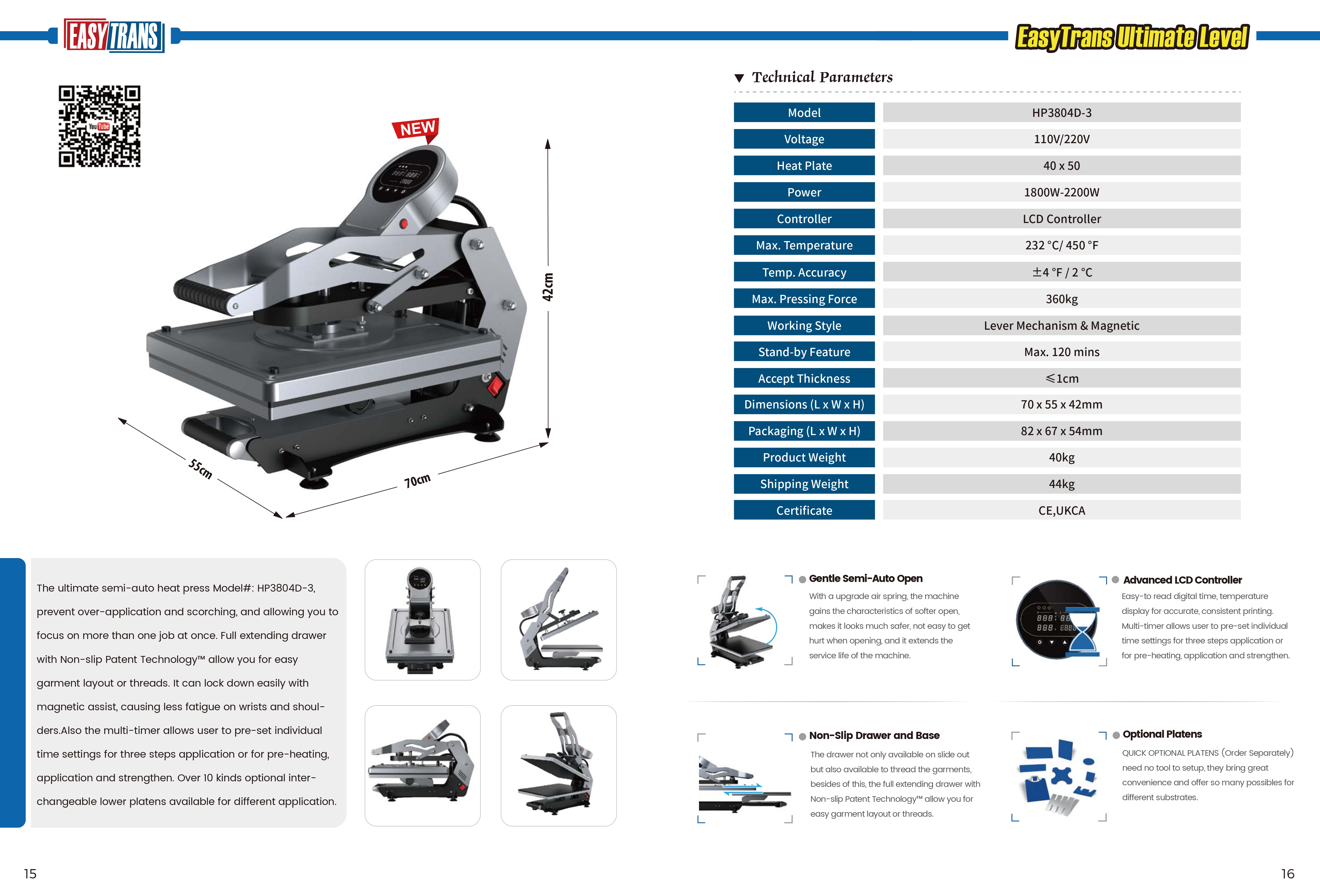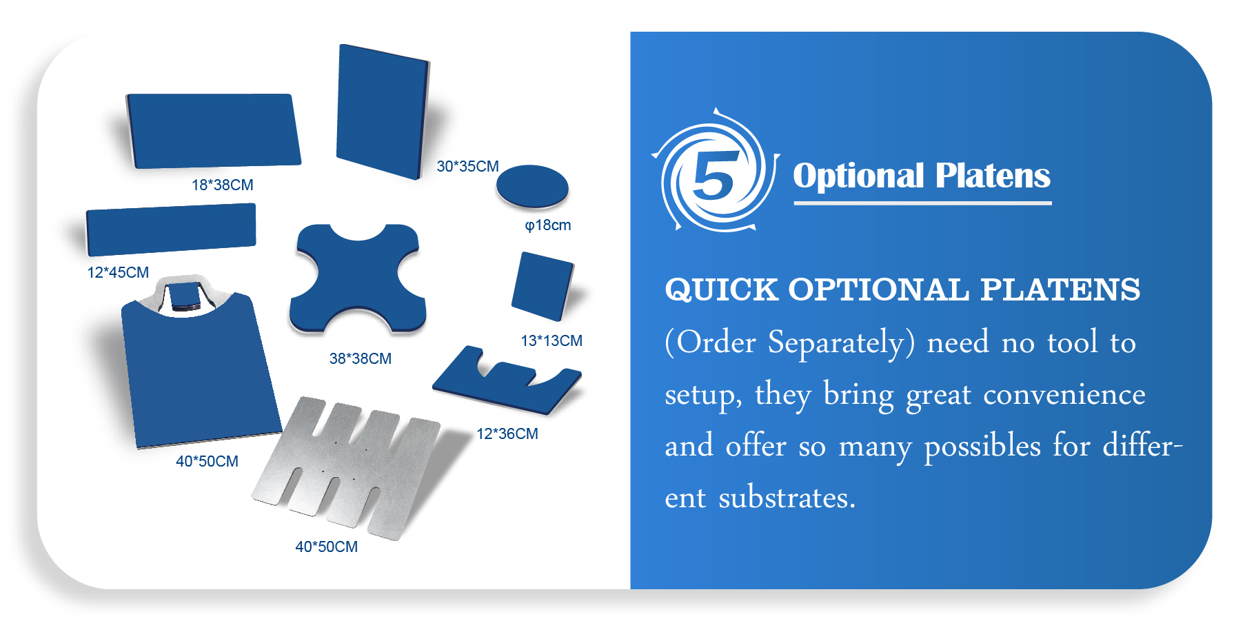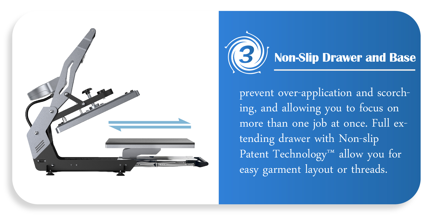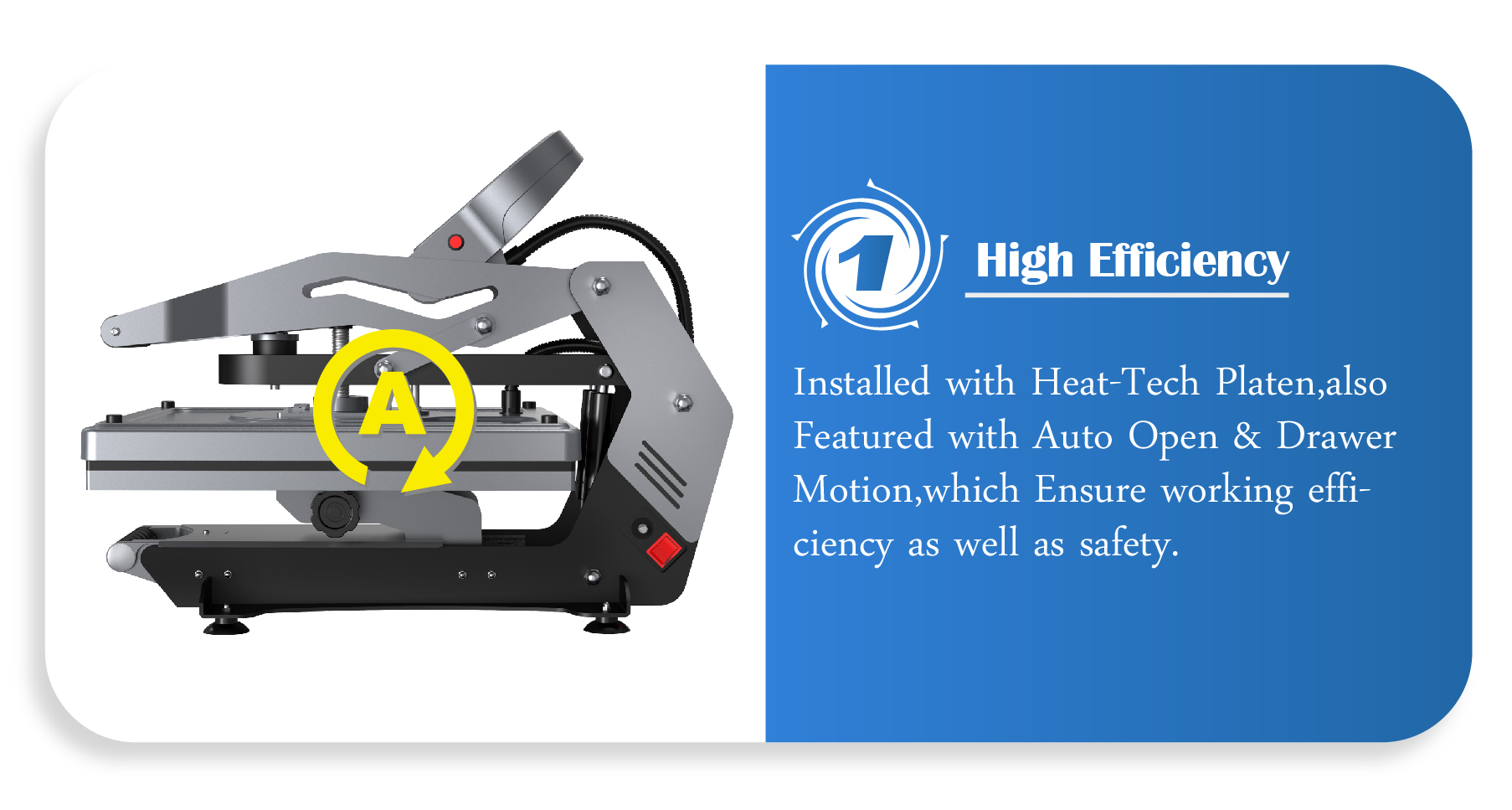 It is installed with a smooth pull-out drawer enable you have sufficient space to load your garment. With the featured base: 1. Quick changeable system enables you to change the accessory platen in few seconds and needs no tool. 2. The thread-able base enables you to load or rotate the garment over the lower platen.