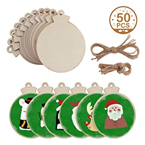 Include 50pcs large size 4.5" blank wood slices with jute twines for Christmas tree ornaments to add a festival ambiance for your home.