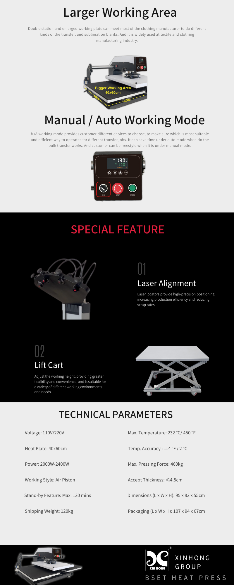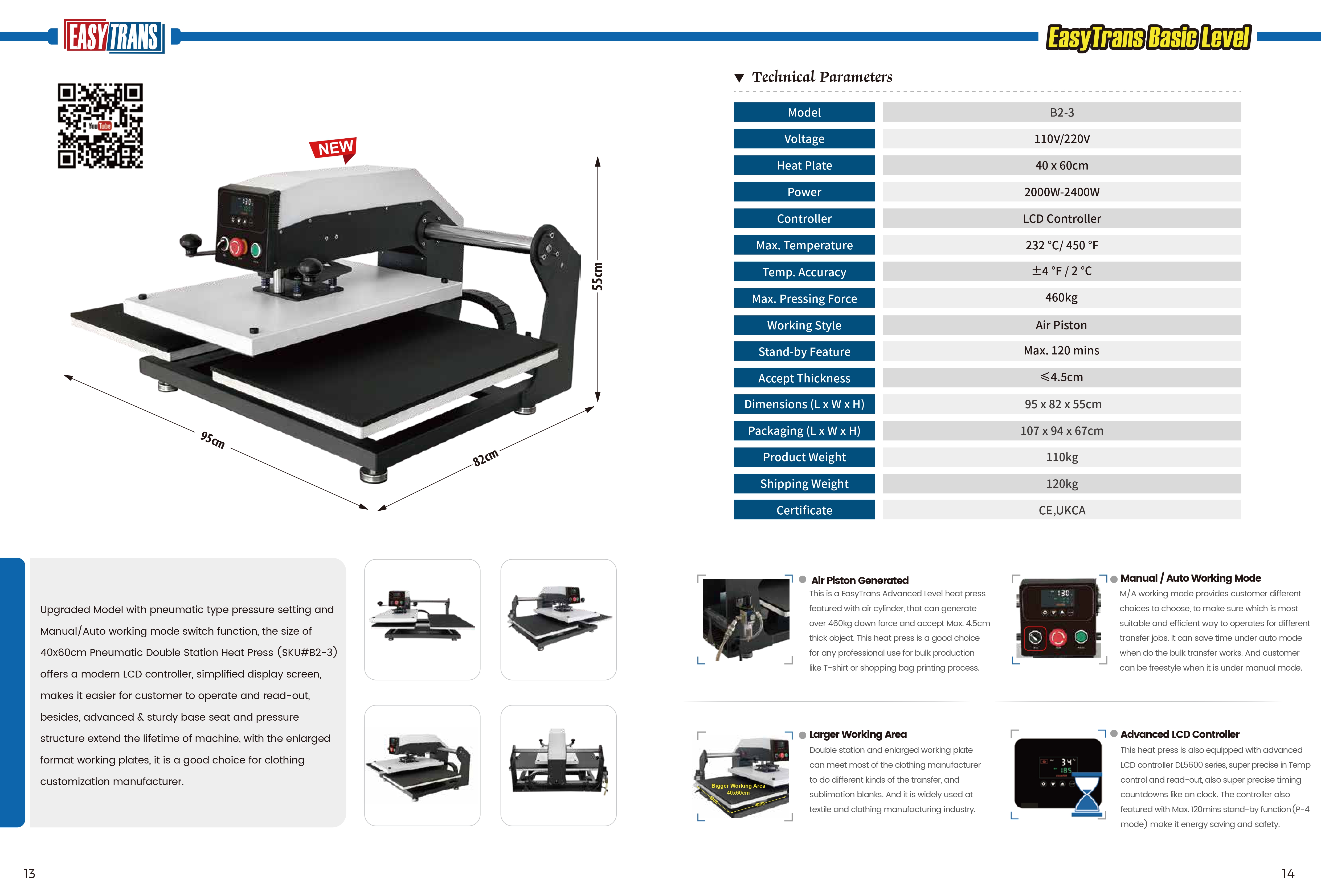This is a EasyTrans Advanced Level heat press featured with air cylinder, that can generate over 460kg down force and accept Max. 4.5cm thick object. This heat press is a good choice for any professional use for bulk production like T-shirt or shopping bag printing process.