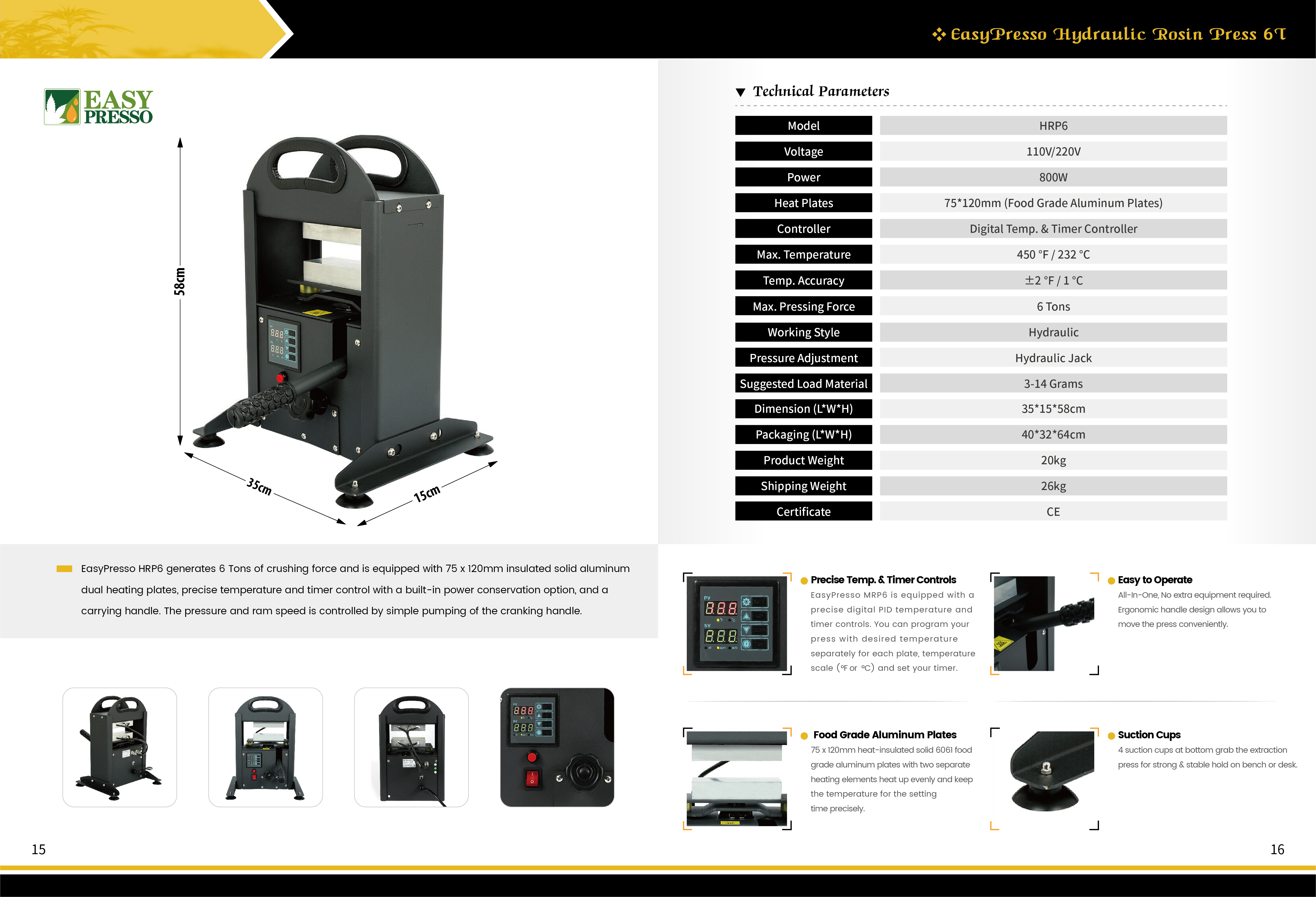 EasyPresso HRP6 generates 6 Tons of crushing force and is equipped with 75 x 120mm insulated solid aluminum dual heating plates, precise temperature and timer control with a built-in power conservation option, and a carrying handle. The pressure and ram speed is controlled by simple pumping of the cranking handle.