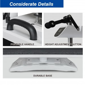 A portable handle can facilitate the movement. The flexible button is easy for adjusting the height. Based on the solid base, the heat press requires stable support to maintain smooth running.