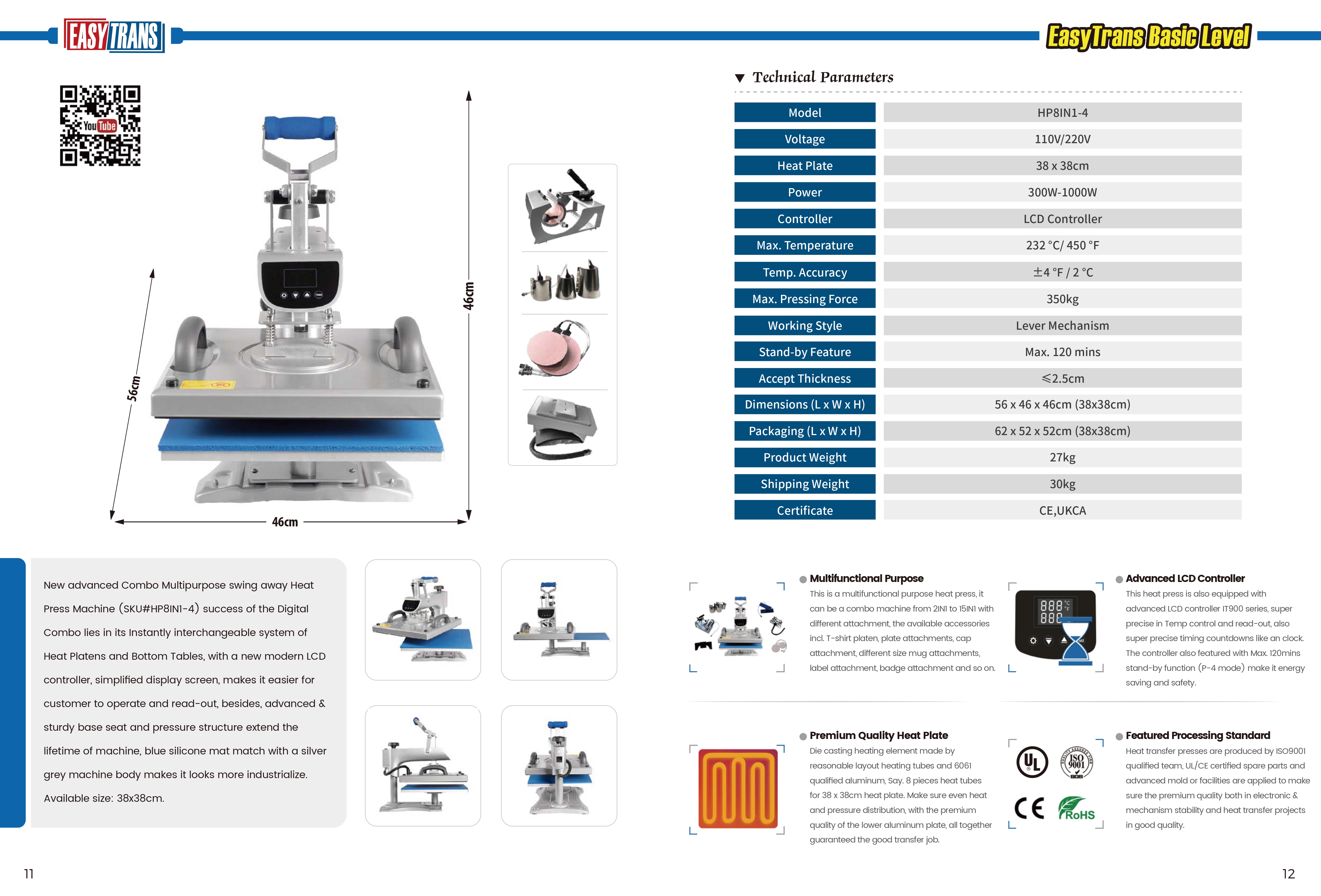 【8-IN-1 VERSATILE KIT】- With a 15"x 15" (38 x 38 cm) large heat platen, the 8 in 1 heat press uses Teflon-coated platen, non-stick & stable. Suitable for applying letters, numbers, and patterns onto caps, T-shirts, mugs, plates, etc.