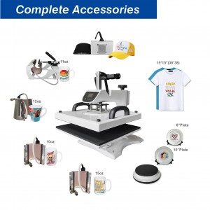 This shirt printing machine with varieties of fittings, including one platen press, one hat/cap press, one mug press, and two plate presses, allowing patterns to transfer onto T-shirts, caps, mugs, plates, and other flat surfaced items.