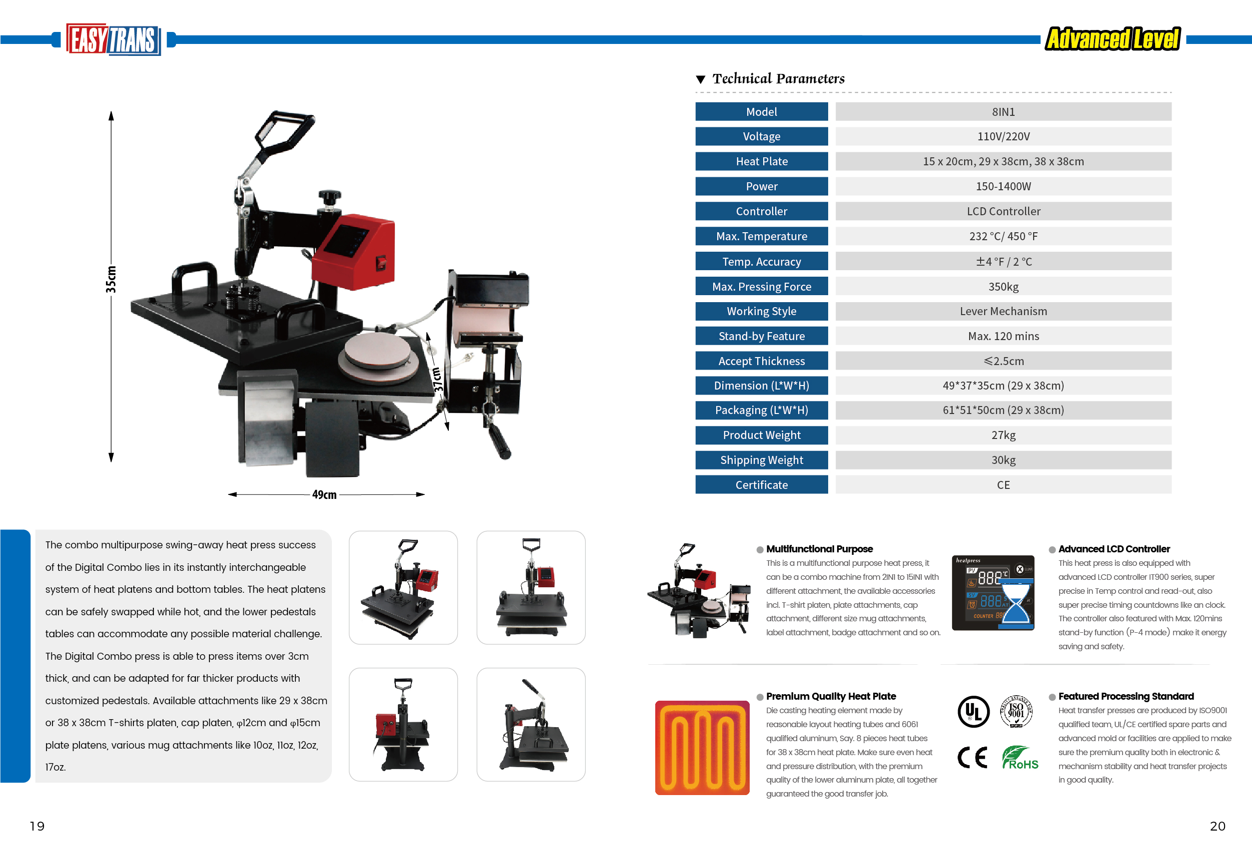【8-IN-1 VERSATILE KIT】- With a 15"x 15" (38 x 38 cm) large heat platen, the 8 in 1 heat press uses Teflon-coated platen, non-stick & stable. Suitable for applying letters, numbers, and patterns onto caps, T-shirts, mugs, plates, etc.