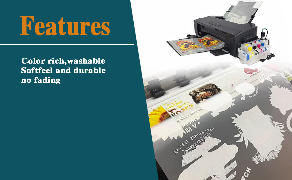 ● SIze:A4 (8.3" x 11.7" / 210 mm x 297mm) High rate color transfer, washable, soft feel and durable.
