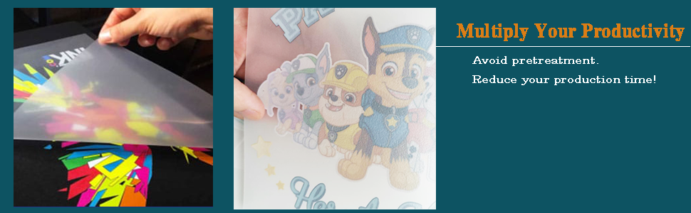 ● No Pretreat:One of the biggest benefits of dtf film does not have to be pretreated, which saves you time and money. You can print on T shirts,Hats,Shorts/pants,Bags,Flags/Banners,Koozies,Any other fabric items.