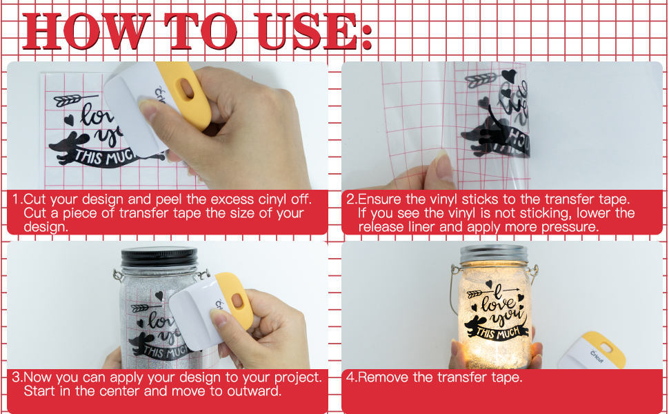● 【CLEAR RED GRID】The 1/2” see through red grid lines makes transfer tape for vinyl easy to measure and cut your vinyl transfer tape without waste. What's more, our transfer tape roll is also tear resistant.