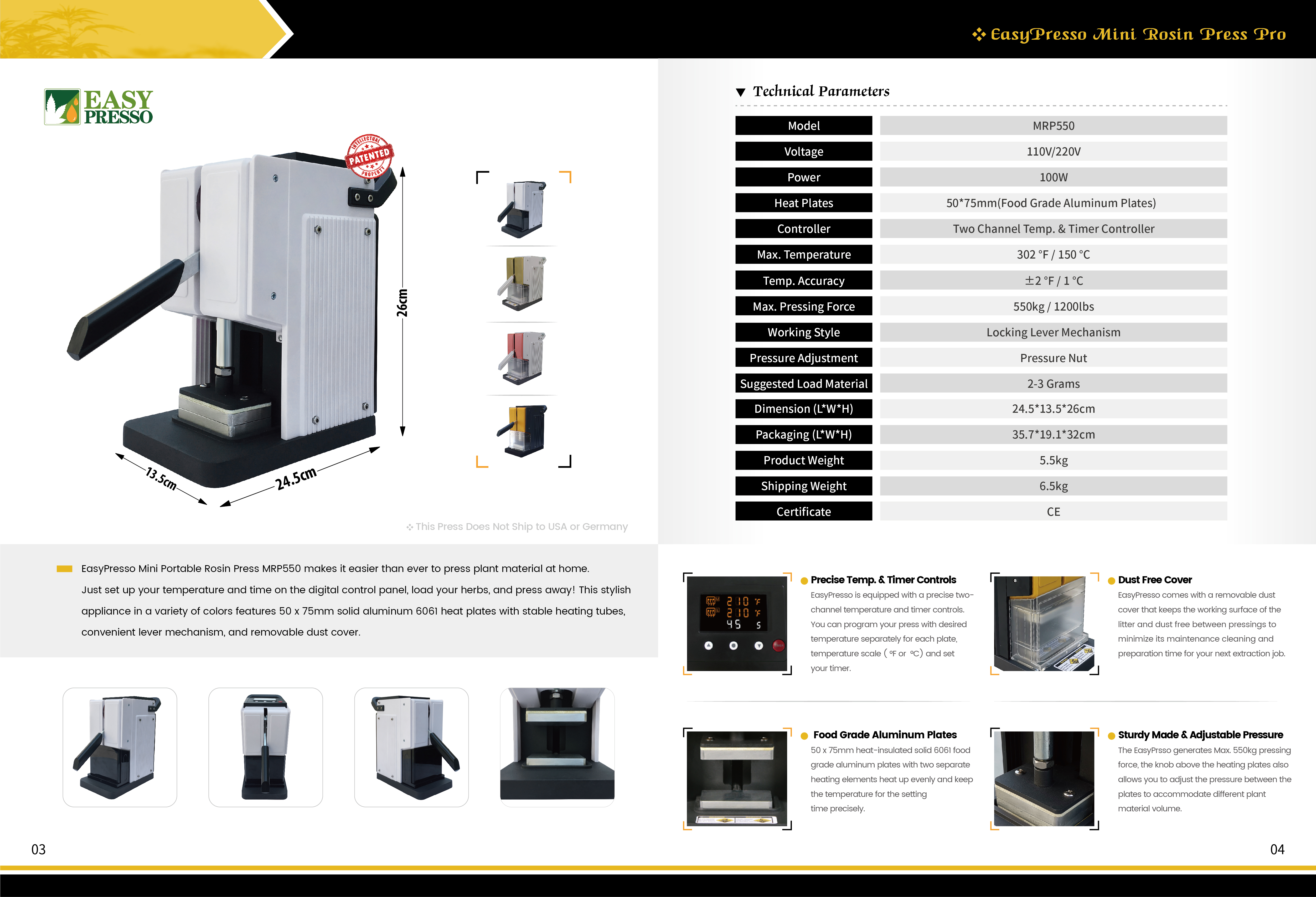 • EasyPresso Mini Rosin Press (Model# RP100) is newest and one of most lightweight model in our press line. Despite being compact, this manual rosin press generates over 500kg of pressing force. The press features sturdy made, a nice locking lever mechanism, adjustable pressure knob, 50 x 75mm dual heating insulated solid aluminum plates, accurate LCD temperature & timing control panel located at the top of the press, also a convenient carrying handle. Portable, sturdy and efficient, it is perfect for household or outside activity. P.S. This Prensa Rosin is Not Shipping to USA or Germany.