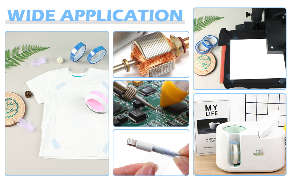 ● 【WIDE APPLICATION】 HTVRONT sublimation heat tape is not only suitable for cup sublimation, but also for 3D printers, heat transfer vinyl for T-shirts, pillows, garments and fabrics. This heat resistant transfer tape is also widely used in the electronics industry for electrical insulation of transformers, motors, coils, capacitors and inverter power supplies.