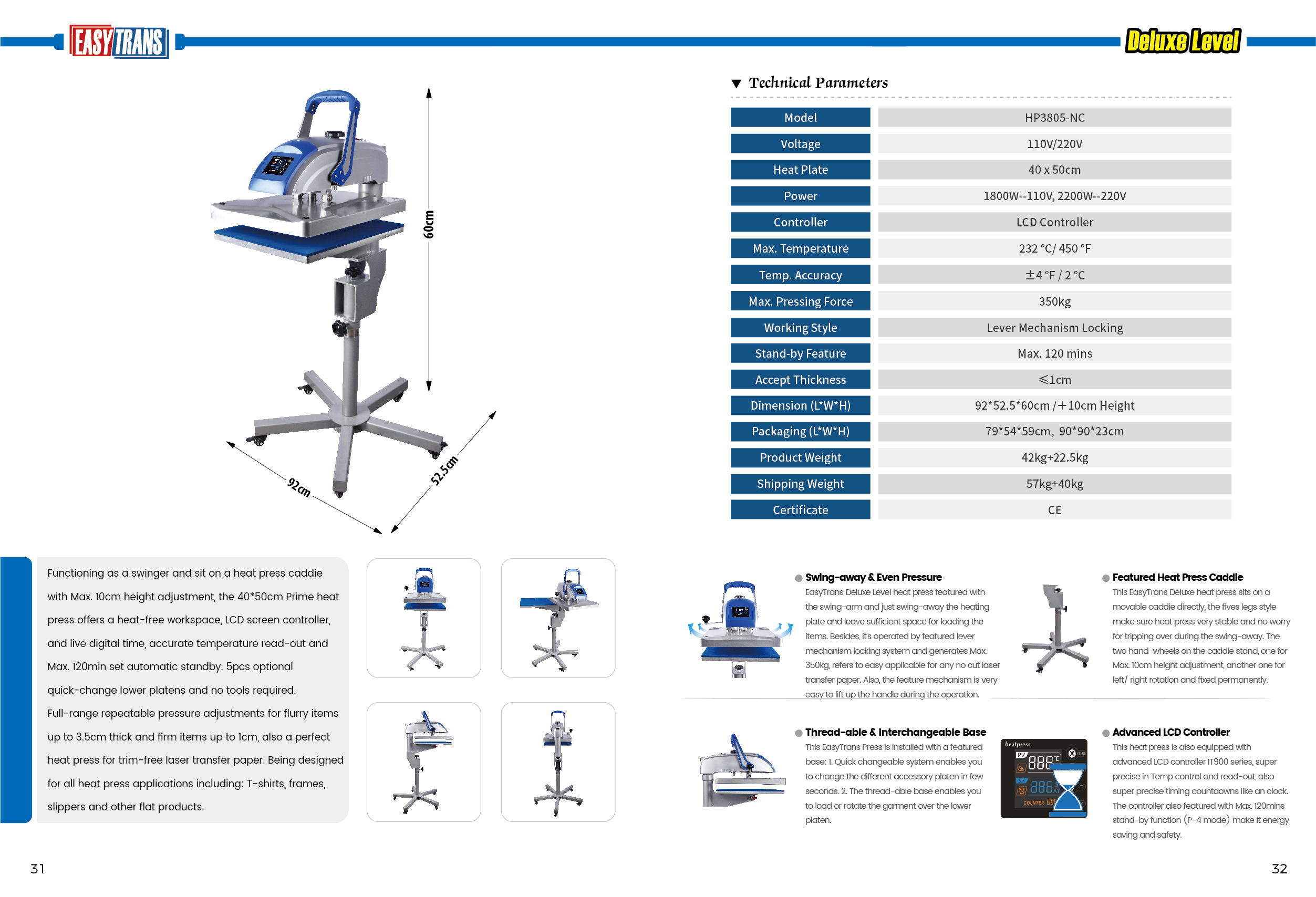Бұл EasyTrans Deluxe жылыту прессі тікелей жылжымалы кәдесыйға отырады, бес аяқ стилі жылу престің өте тұрақты болуын қамтамасыз етеді және бұрылу кезінде құлап кетуден қорықпайды. Кадди стендіндегі екі қол дөңгелегі, біреуі Максқа арналған. 10 см биіктік реттеуі, екіншісі солға/оңға айналдыруға арналған және тұрақты бекітілген.