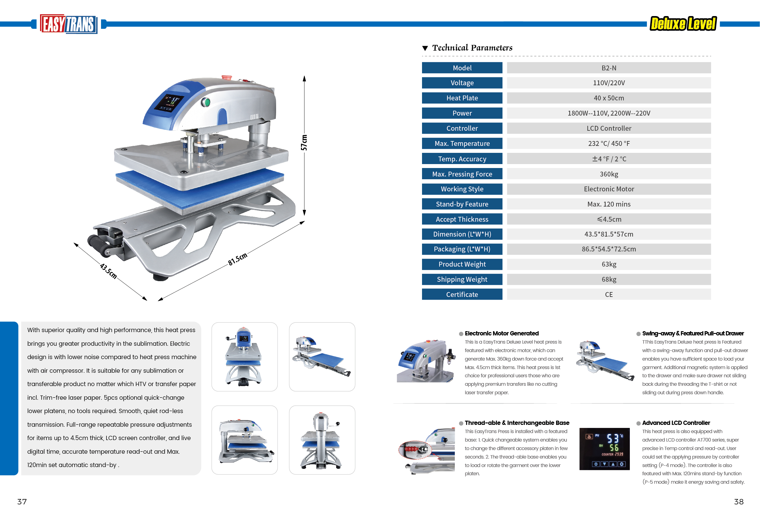 This is a EasyTrans Deluxe Level heat press is featured with electronic motor, which can generate Max. 360kg down force and accept Max. 4.5cm thick items. This heat press is 1st choice for professional users those who are applying premium transfers like no cutting laser transfer paper.