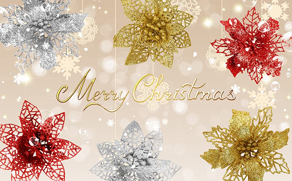 ● 12 Pcs Glitter Poinsettia Flowers:The christmas poinsettia decorations include 6 Gold Christmas glitter poinsettia flowers,4 Silver glitter poinsettia flowers,2 Red glitter Christmas flowers.Get christmas tree theme ready for glitters galore Poinsettia Flowers.