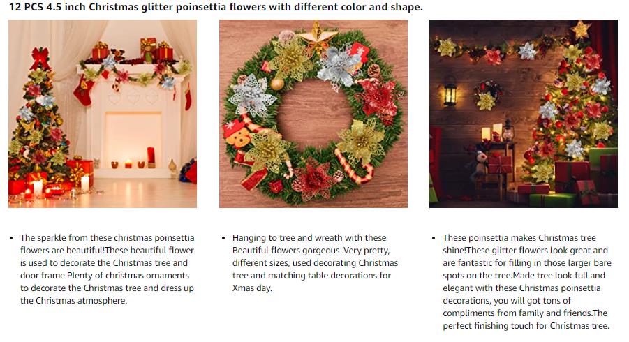 ● Decorations For Christmas:These poinsettia makes Christmas tree shine!These glitter flowers look great and are fantastic for filling in those larger bare spots on the tree.Made tree look full and elegant with these Christmas poinsettia decorations, you will got tons of compliments from family and friends.The perfect finishing touch for Christmas tree.