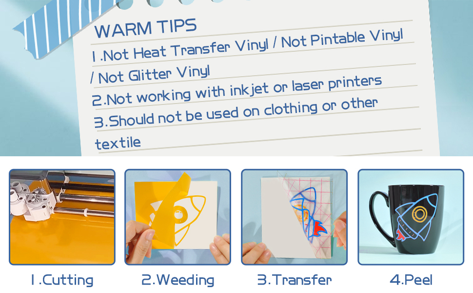 ● 【4 steps】The vinyl is compatible with all electronic craft-cutting machines, allowing you to cut, weed, peel and apply the vinyl easily to the object or other flat surface. The extra thickness can effectively avoid curling and pierced.