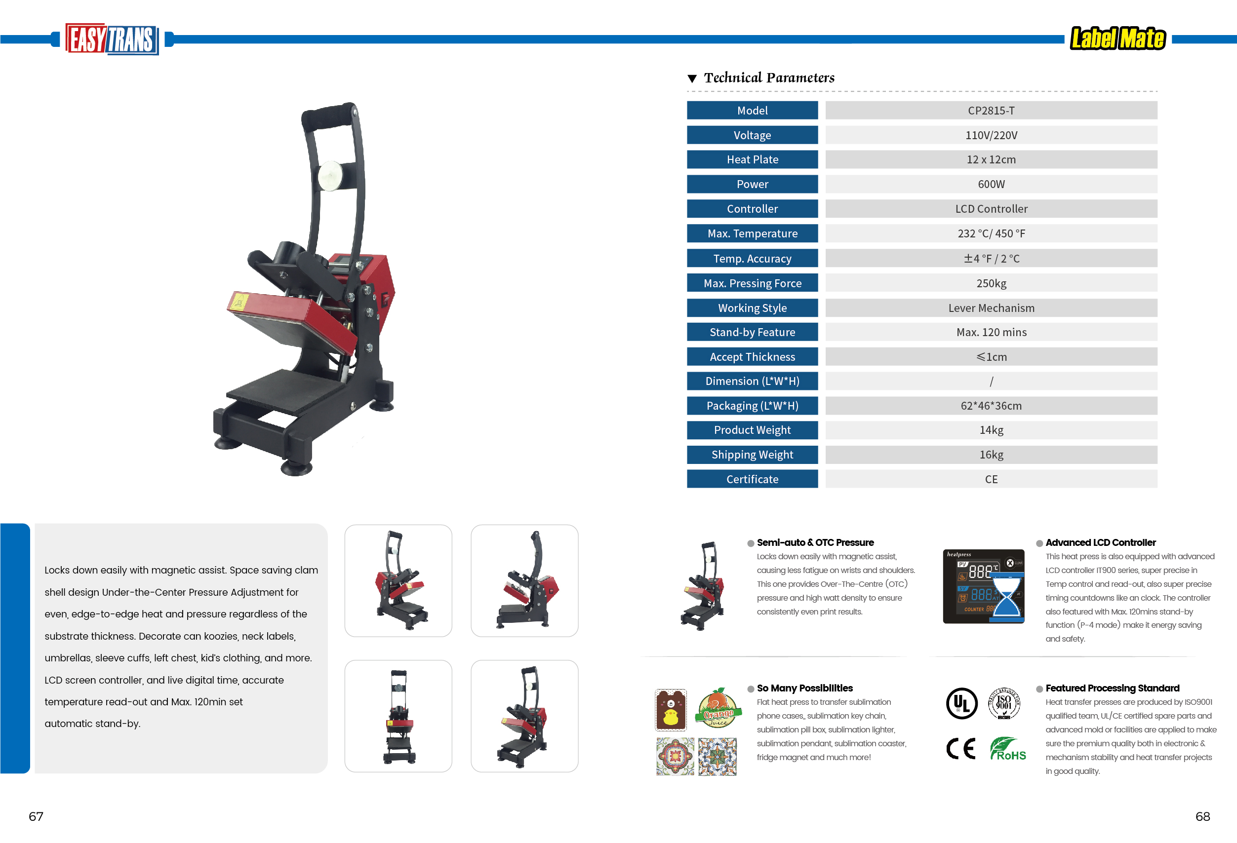 Nilagyan din ang heat press na ito ng advanced na LCD controller na seryeng IT900, sobrang precise sa Temp control at read-out, super precise na timing countdown tulad ng isang orasan. Itinampok din ang controller kasama ang Max. 120mins stand-by function (P-4 mode) gawin itong pagtitipid at kaligtasan ng enerhiya.