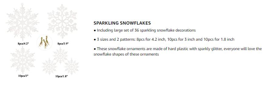 ● SNOWFLAKES OF VARIED SIZES: A value pack of 36pcs white Christmas glitter snowflakes in 3 varied sizes and 2 different patterns: 8pcs for 4.2 inch for both styles, 10pcs for 3 inch and 10pcs for 1.8 inch. It’s a lot of snowflakes sufficient for your Christmas decorations