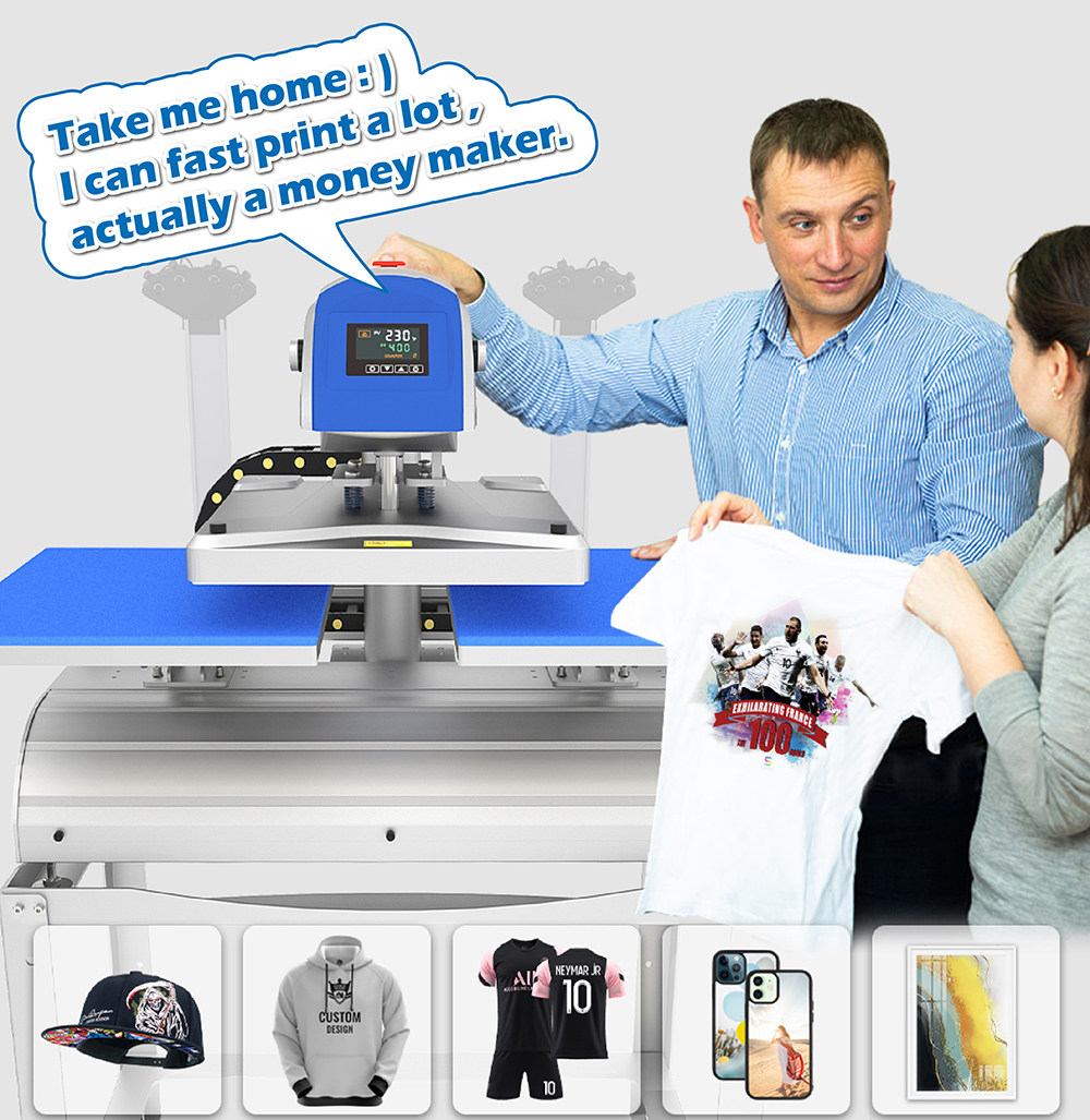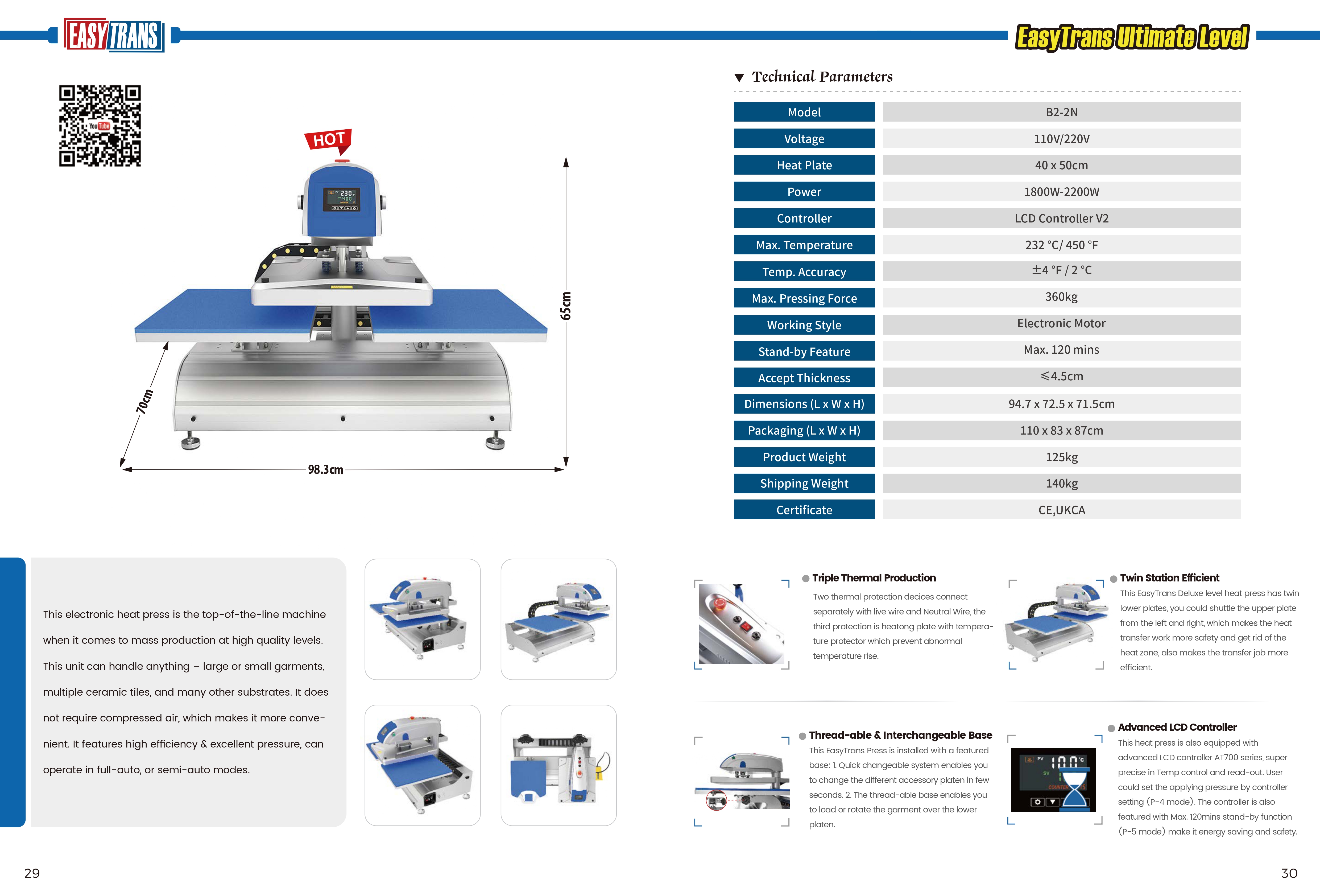 Гэты цеплавой прэс EasyTrans Deluxe мае двайныя ніжнія пласціны і можа быць паўаўтаматычным або цалкам аўтаматычным з адным пераключальнікам. Гэты электрычны награвальны прэс абсталяваны HMI/PLC, каб карыстальнік мог кантраляваць хуткасць руху шатла, а таксама мець магчымасць ліквідаваць непаладкі, калі гэта неабходна.