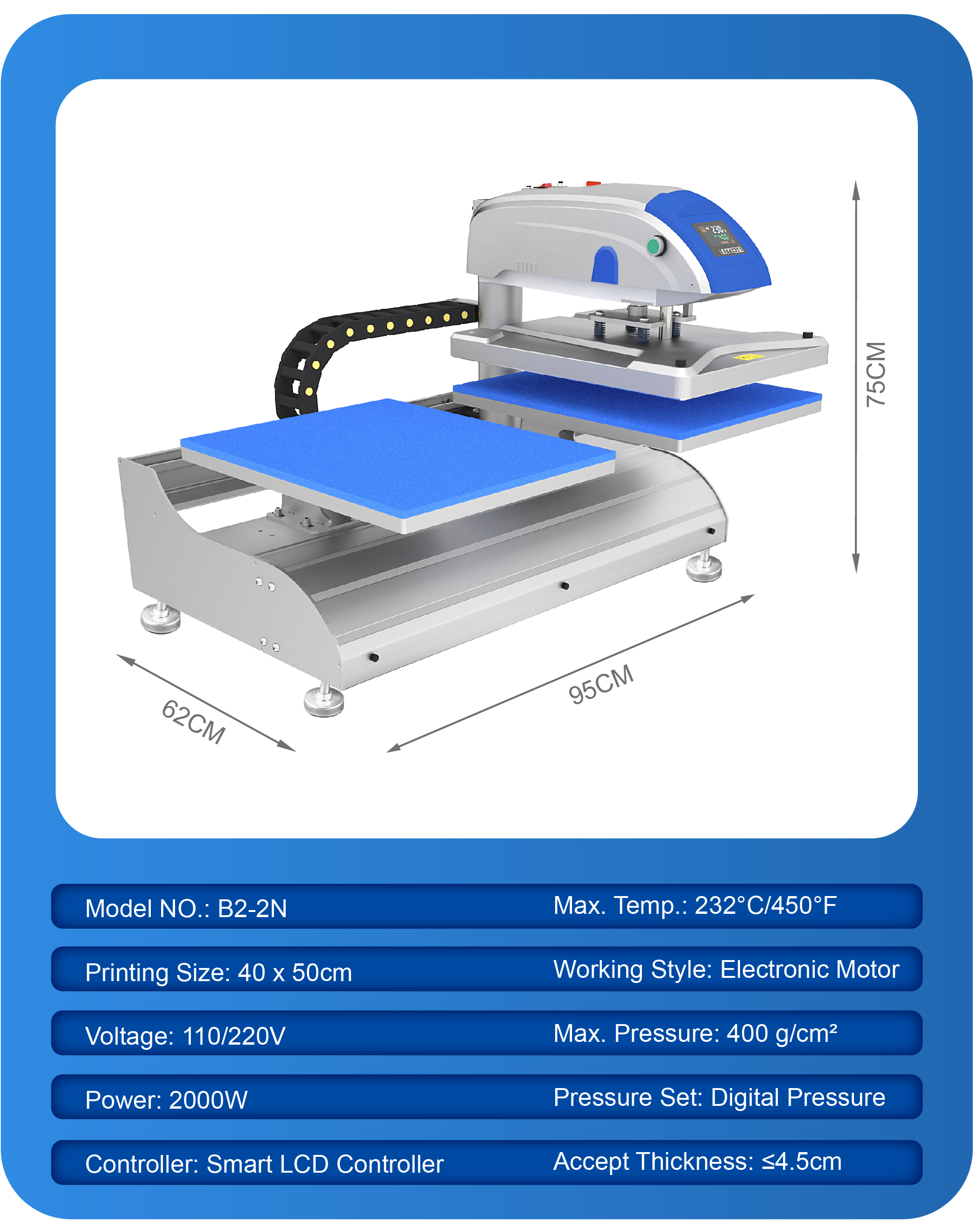 Гэты тэрмічны прэс таксама абсталяваны ўдасканаленым ВК-кантролерам серыі AT700, вельмі дакладным у кантролі тэмпературы і счытванні. Карыстальнік можа задаць ціск пры дапамозе налад кантролера (рэжым P-4). Кантролер таксама прадстаўлены з Max. Функцыя чакання 120 хвілін (рэжым P-5) забяспечвае эканомію энергіі і бяспеку.