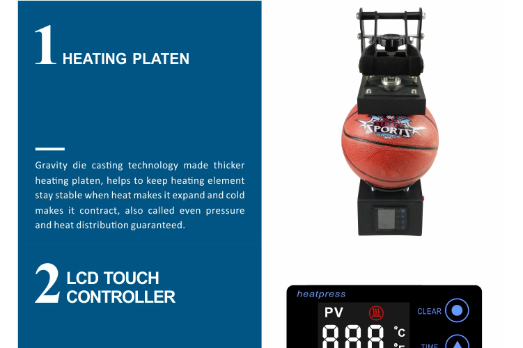 આ હીટ પ્રેસ ખાસ કરીને ઇન્ફ્લેટેબલ યુથ લીગ સ્પોર્ટ બોલમાં વ્યાવસાયિક બોલમાં વ્યક્તિગત અથવા કસ્ટમાઇઝ કરવા માટે રચાયેલ છે. પ્રેસ ગ્રાહકોને તેમની સજાવટની ક્ષમતાઓને વધુ વિસ્તૃત કરવાની મંજૂરી આપે છે. ગ્રાહકો ટીમનો લોગો, શાળા નામ, ટીમનો ફોટો, પ્રાયોજક લોગો, કોર્પોરેટ કમર્શિયલ લોગો અથવા બોલમાં ખેલાડીનું નામ /નંબરો ઉમેરી શકે છે.