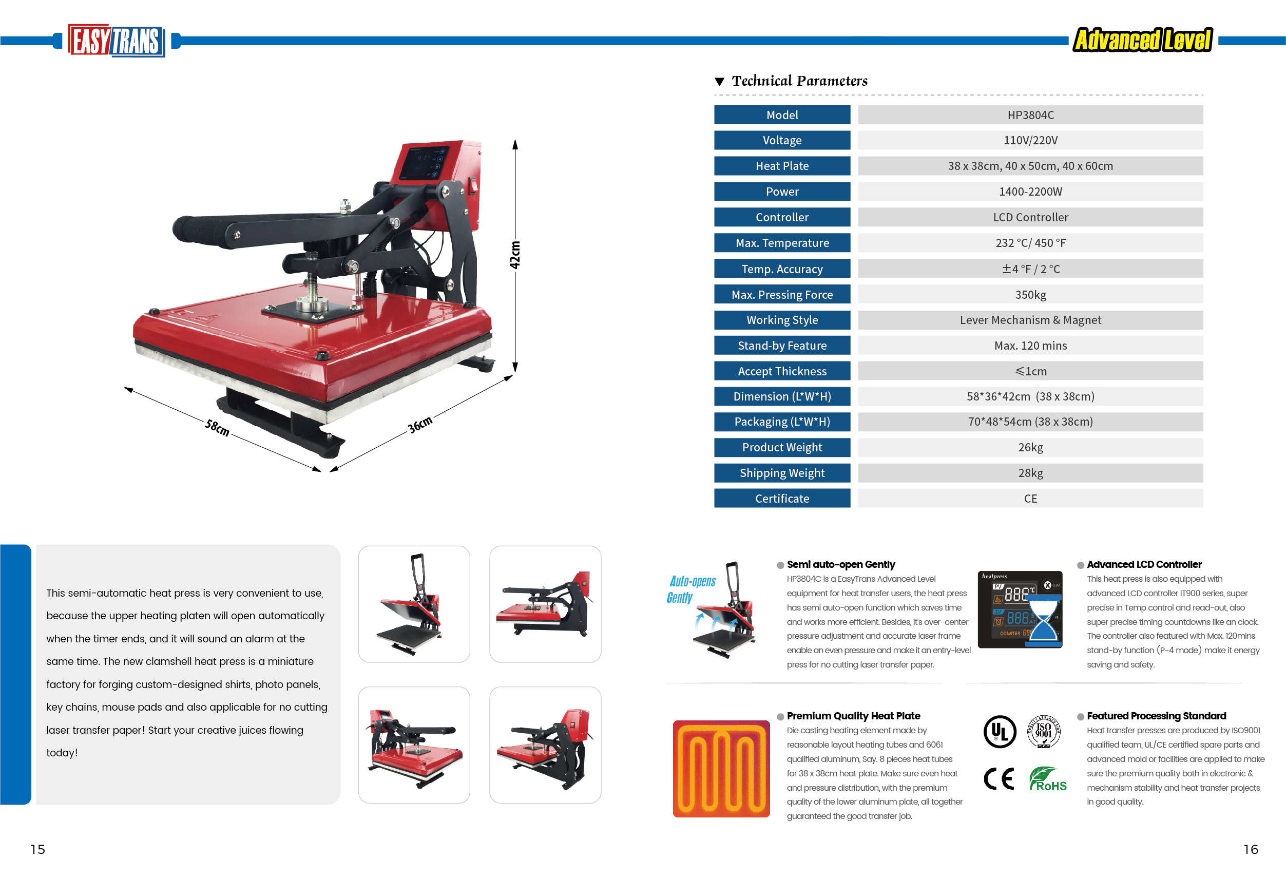 HP3804C shine EasyTrans Advanced Level kayan aiki don masu amfani da canja wurin zafi, da zafi latsa yana da Semi auto-bude aiki wanda ceton lokaci da kuma aiki mafi inganci. Bayan haka, yana da kan-tsakiyar matsa lamba daidaitawa da daidai Laser firam taimaka wani ko da matsa lamba da kuma sanya shi wani shigarwa-matakin latsa domin babu yankan Laser canja wurin takarda.