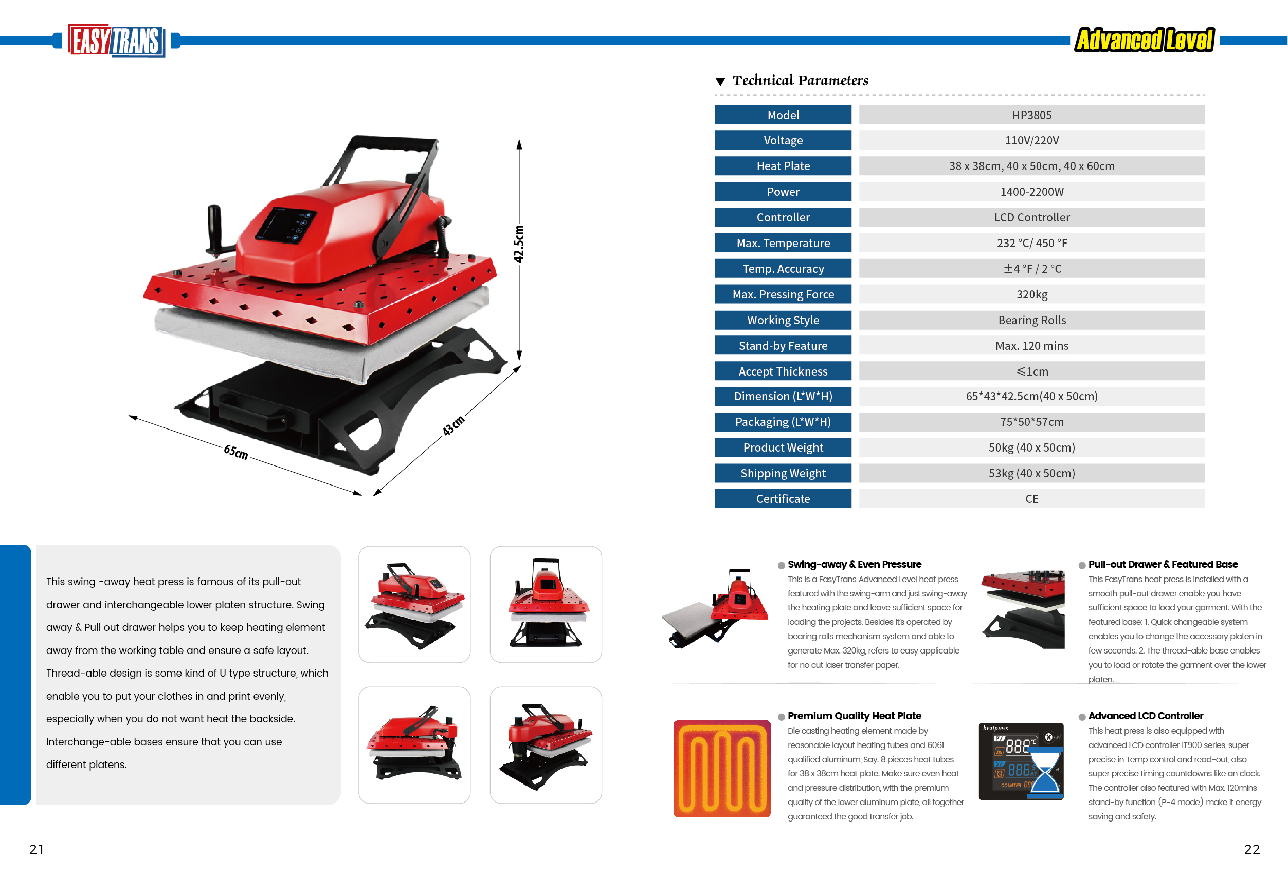 EasyTrans Advanced Level hitapressan er lausn á hvers kyns faglegum flutningum. Það er lína af háþróaðri hitapressu og hápunktur snjallrar hugmyndar. Hitapressurnar eru hannaðar fyrir þig, fyrirtækið, sem vinnur með hitaflutningsvínyl (HTV), hitaflutningspappír, sublimation og hvítt andlitsvatn osfrv. Notaðu hitapressurnar til að búa til sérsniðna stuttermabol, íþróttafatnað, treyjur, borða, bakpoka, ermar, peysur og fleira. Fáanlegar í 40x50 cm, hitapressurnar eru með útrennanlega og margbreytilega neðri plötu. Svo þú getur unnið í burtu frá hitanum og svo mörgum möguleikum.