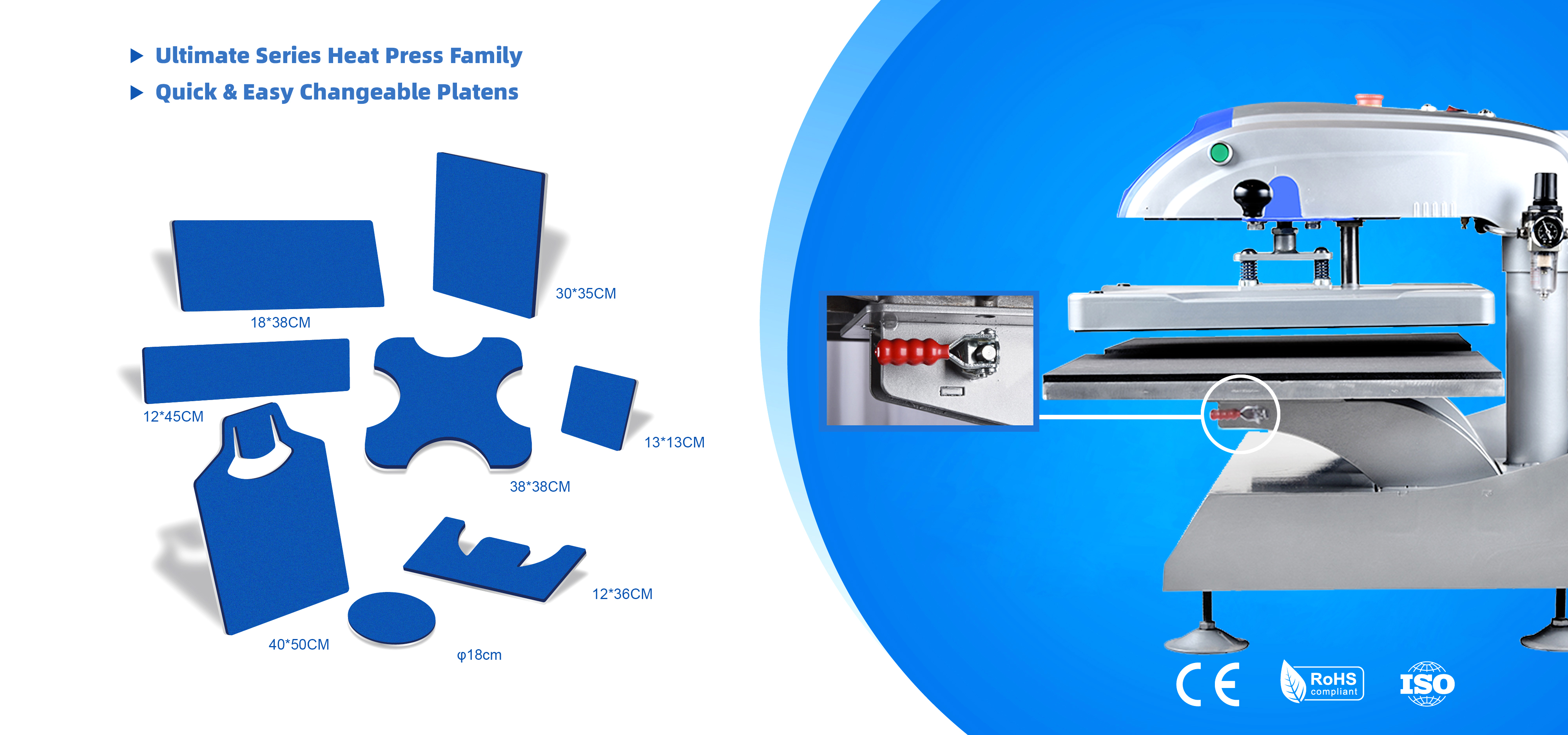 공압식 듀얼 스테이션 열 프레스는 플래튼에서 플래튼으로 전환이 가능하여 빠르고 쉽게 의류에 실을 끼우고 꺼낼 수 있습니다.