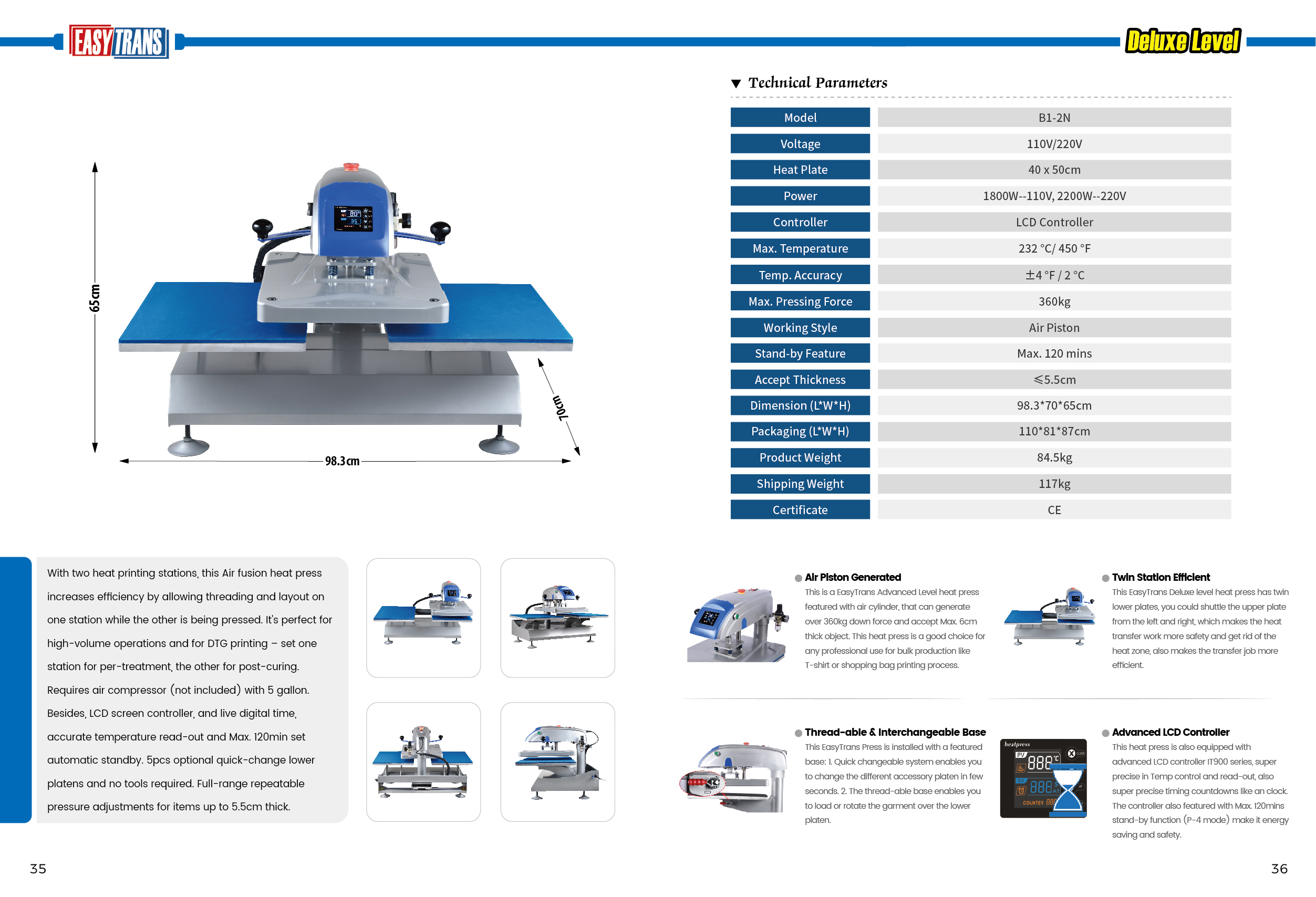 이 제품은 에어 실린더를 탑재한 EasyTrans 고급형 열 프레스로, 360kg 이상의 하중을 생성하고 최대 6cm 두께의 물체를 수용할 수 있습니다. 이 열 프레스는 티셔츠나 쇼핑백 인쇄와 같은 대량 생산을 위한 전문적인 용도에 적합합니다.