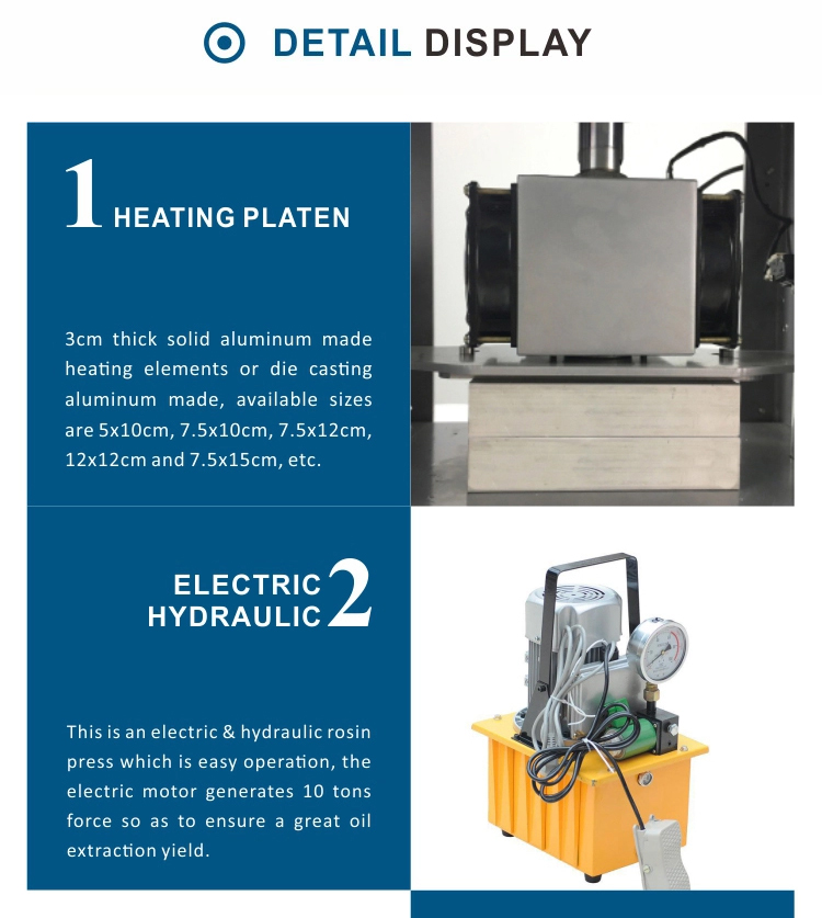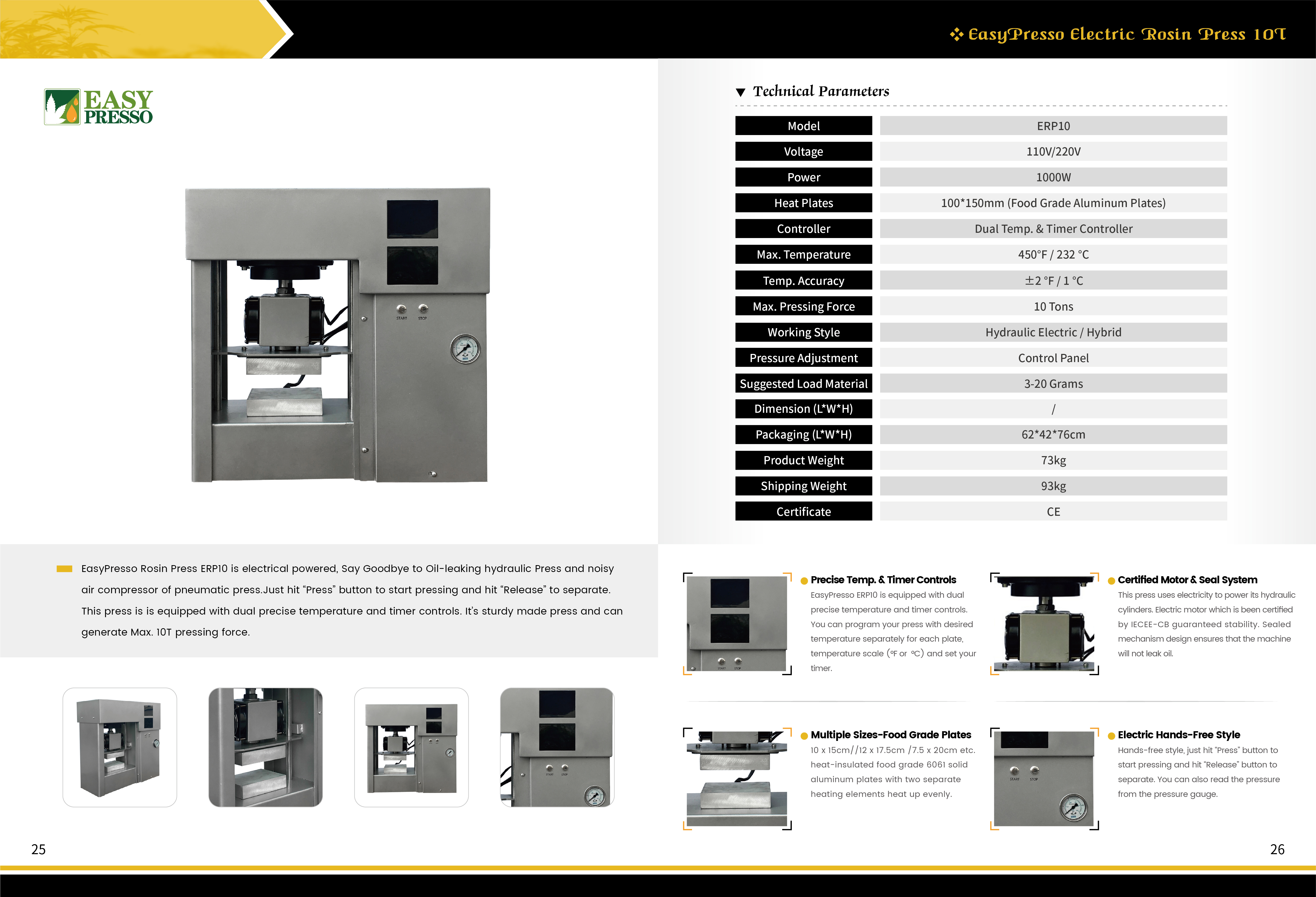 EasyPresso ERP10 пресси электрикӣ бо нерӯи барқ кор мекунад, бо Пресси гидравликии аз равған хориҷшаванда ва компрессори ҳавои пурғавғои пресси пневматикӣ видоъ кунед. Барои оғоз кардани пахш кардан танҳо тугмаи "Пресс" -ро пахш кунед ва барои ҷудо кардан "Разо" -ро пахш кунед. Ин пресс бо назорати дугонаи дақиқи ҳарорат ва таймер муҷаҳҳаз аст. Он пресси мустаҳкам аст ва метавонад Максро тавлид кунад. Қувваи пахшкунии 10T.