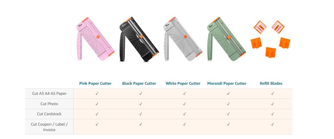 ● Пакет містить: 1 різак для паперу формату A5, 1 шт. змінне ріжуче лезо. Конструкція для різання паперу формату A4/A5/A6, натисніть і рівномірно ковзайте лезом уздовж надрукованих ліній, щоб легко завершити ідеально рівний розріз.